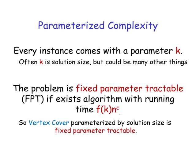 | We finish the discussion of parameterized complexity by considering alternative parameters. Then we start discussing linear programming. |