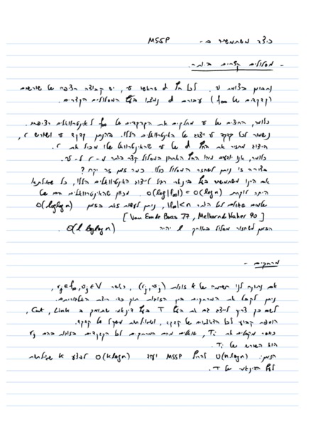 | We start with a recap of the MSSP algorithm and discuss how the data structure can be used to report shortest paths and distances. The bulk of this lecture is devoted to a nearly-linear time algorithm for shortest paths in the presence of negative lengths. The heart of the algorithm is a procedure to implement the Bellman-Ford algorithm on the dense distance graph - the complete graph on vertices of a cycle separator, where the length of an edge in the DDG corresponds to the length of a shortest path between its endpoints in the underlying planar graph. We show that implementing an iteration of Bellman-Ford can be cast into the problem of finding all column minima in the weighted incidence matrix of the DDG. We then introduce the Monge property, and show that we can find all column minima of a Monge matrix in time that is nearly linear in the number of rows. Finally we show that the weighted incidence matrix of the DDG can be decomposed into a small number of Monge matrices. |