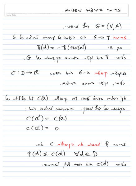 | We start our treatment of flow in planar graphs by relating circulations in the primal graph with face potentials in the planar dual. We show that the residual capacity of a dart with respect to a primal circulations is the slack cost of that dart in the dual with respect to the corresponding potential function. This establishes a connection between distances in the planar dual and capacity respecting circulations in the primal. We use this relation to give a linear-time algorithm for maximum st-flow when the source and sink lie on the same face. We conclide by briefly discussing a nearly linear-time algorithm for maximum st-flow in directed planar graphs. The algorithm resembles the MSSP algorithm. |